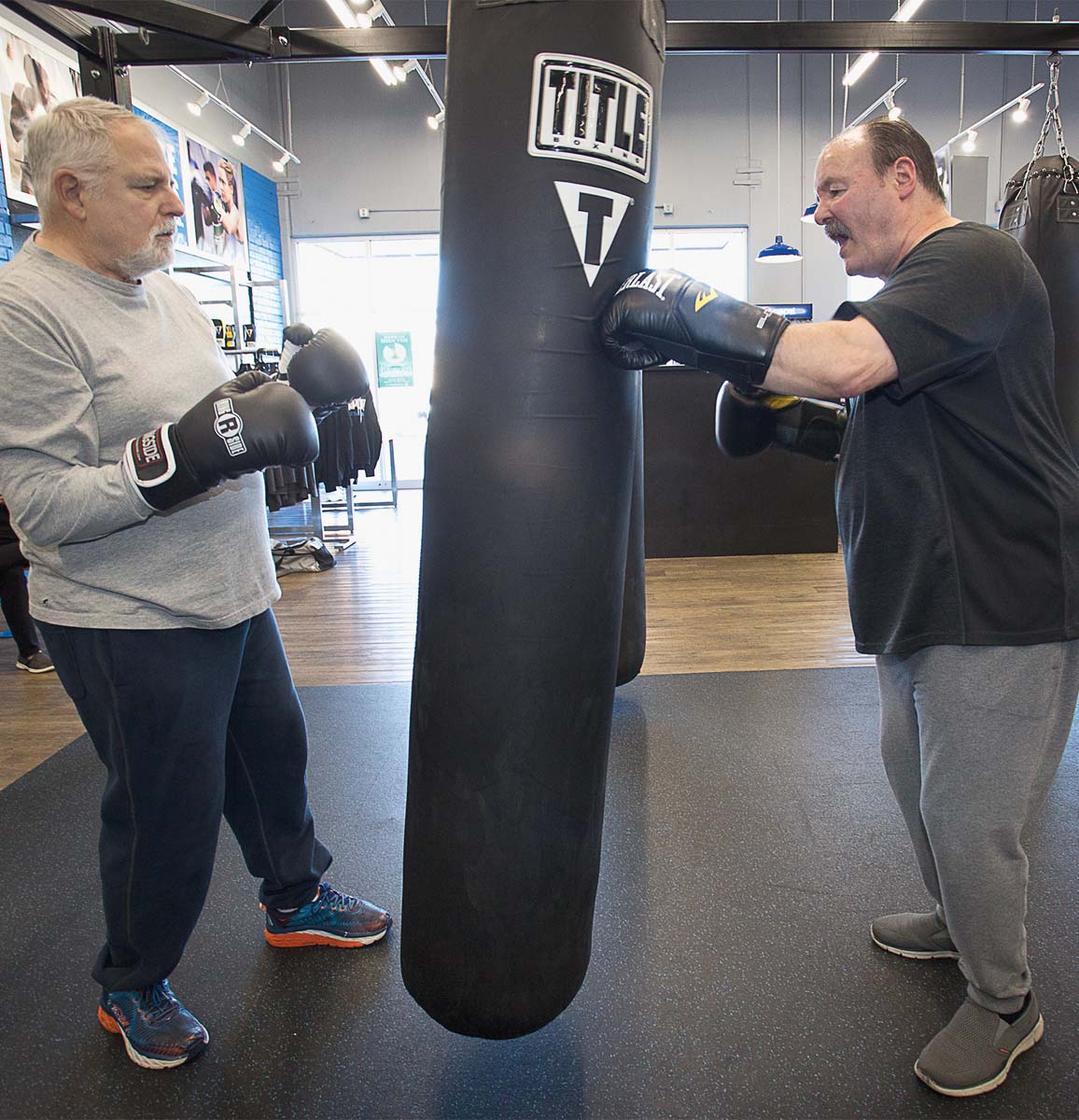 During a typical class, Austen works one-on-one with participants, alternately joking (he gives nicknames to each boxer) and gently guiding them in voice exercises, bilateral movements and a little sparring — all movements and actions that tend to decline in Parkinson’s patients. The students have varying levels of symptoms, and the couple tailor the exercises to each individual.