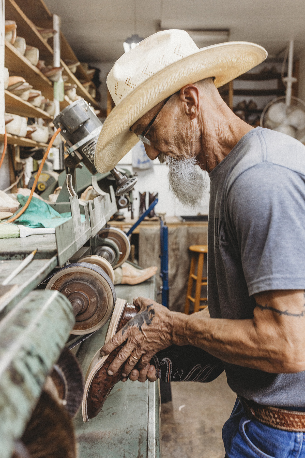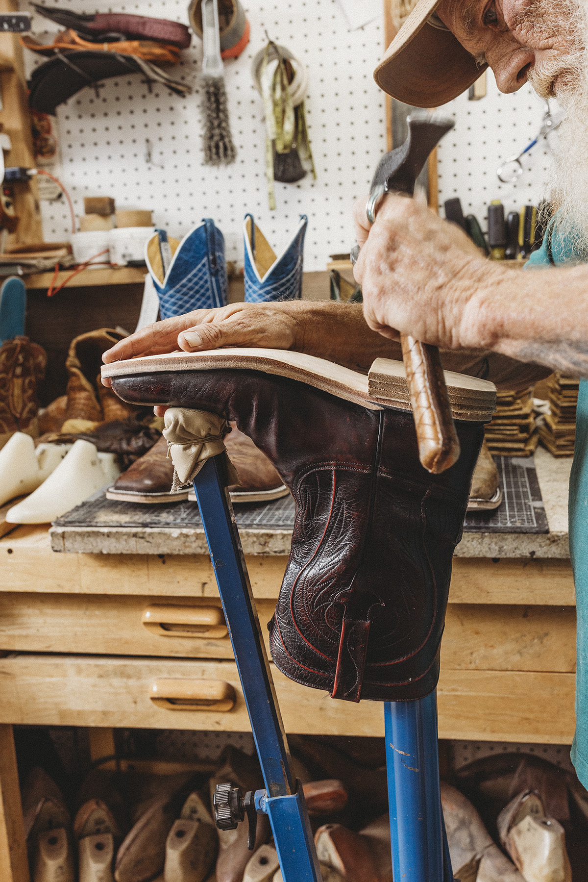 “If you look at the sole lines, you’ll see slight wiggles in them,” he says, explaining how handmade boots tell their own story. “A computer will make it perfect. But this — this is a human touch.”