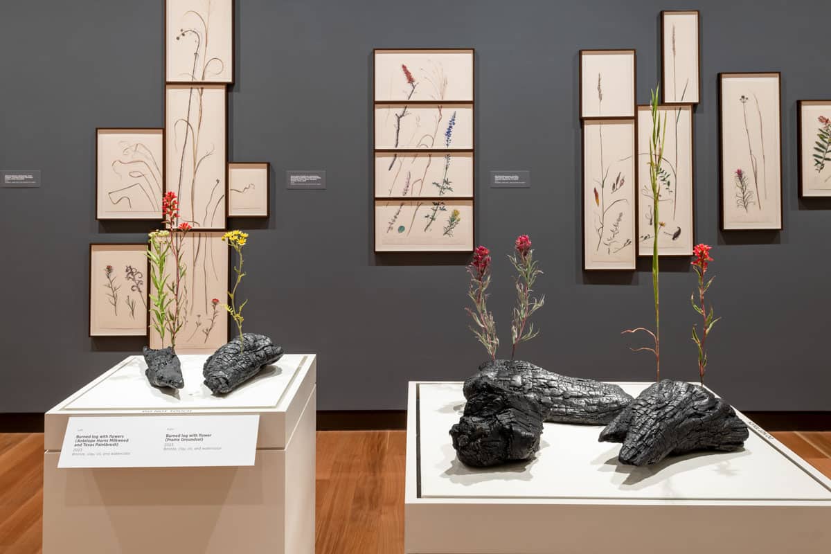 “Burned log with flower” is one of the pieces on display at the “Trespassers: James Prosek and the Texas Prairie” exhibit at the Amon Carter Museum of American Art. Photo courtesy of Amon Carter Museum of American Art