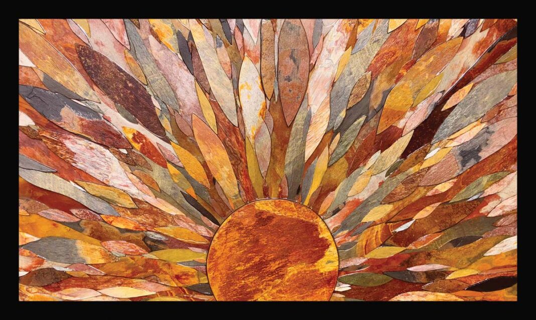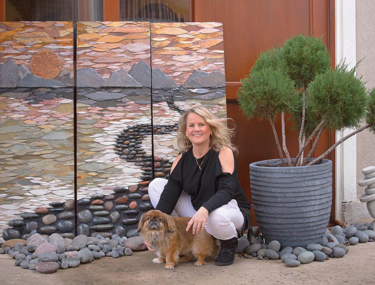 Before she begins setting a single piece, she sketches the design on paper. The resin gives her about 12 hours of working time before it sets. Most of the large works are done in panels, making them easier to transport and hang. The multidimensional artwork is tactile; it invites the viewer to move in closer to see the marbled colors in the layers of slate, the hints of glitter that fill in nooks and crevices, the curved paths of stones she has created to look like rivers. “Sometimes I like to add a little color using a gemstone such as labradorite. For custom work, clients have asked me to use rocks that are special to them.”