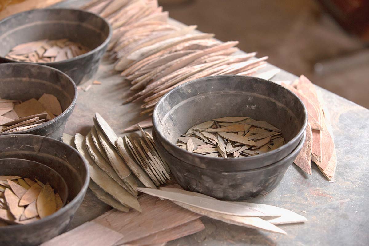 She finds a piece she likes, trims the edges with special scissors and then lightly sands the edges. After she’s satisfied with its shape, she adds it to one of the many metal bowls filled with more thin slivers of slate, all shaped like perfect feathers of different