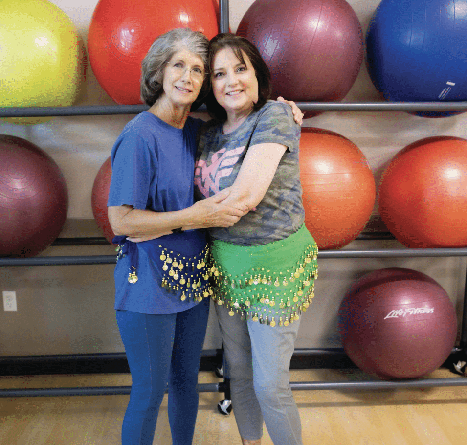 Patti Crummel and Mitzi Gault laugh while doing a Zumba class at the Texas Health Harris Methodist Hospital Southwest Fort Worth fitness center on a Friday morning. Each dancer is decked out in a jingly skirt that ties around the waist.