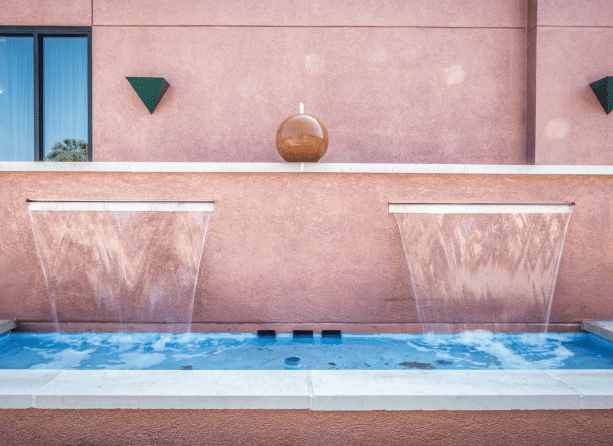 Turning down Neville Street, more art catches the eye in the form of a water fountain and a steel twoheaded dragon. Another sculpture that looks like pipes falling to the ground is near a peaceful sitting area.