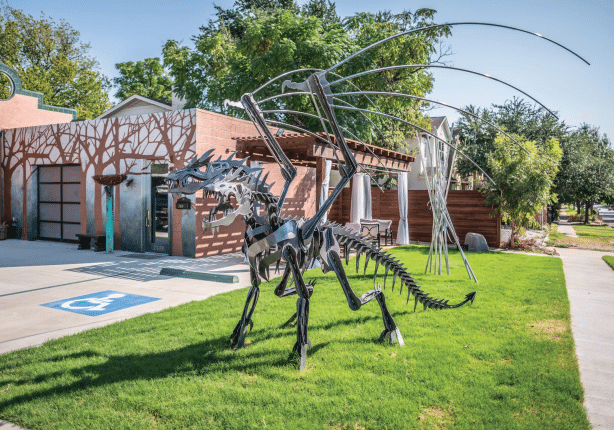 Artist Rebecca Low, whose studio is down the street from House of NeVille, built the “Unbundled” pipes sculpture outside, and local artist Rick Luepke made the two-headed dragon and raptor sculptures.
