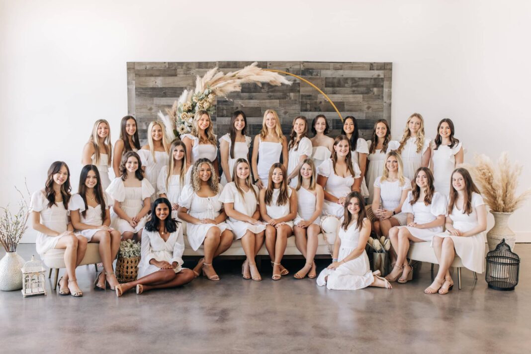 The seniors wore white evening gowns, while the remaining chapter members in attendance wore black. For the celebration, the event chair, Letta Burger, decorated the ballroom and stage with shades of pink and white.