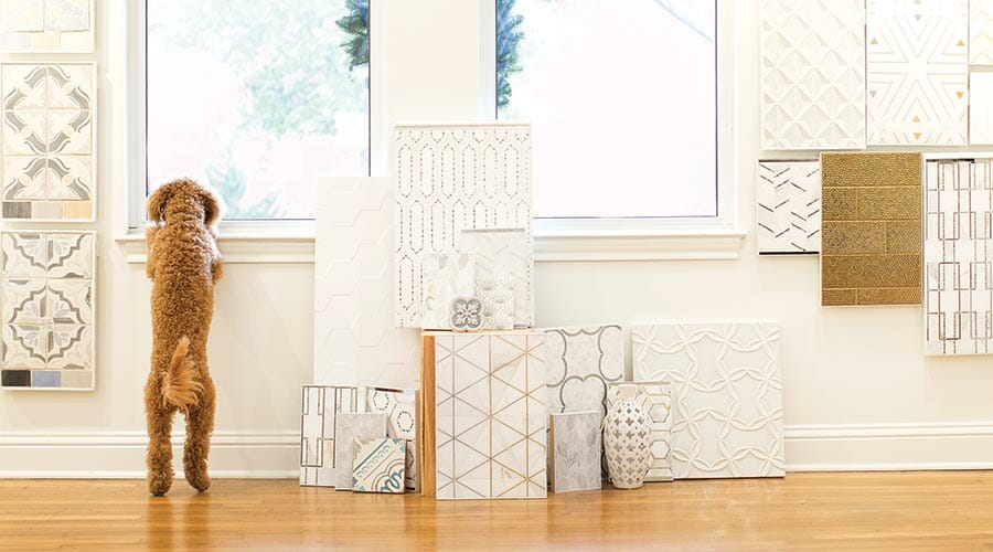 Customers arriving at the Fort Worth tile showroom and interior design studio often are greeted by the miniature goldendoodle with a few choice woofs. “The barking is something new,” shop owner Caryn Evans says. But almost immediately the curly-headed girl with the tawny-brown eyes decides to go all flirtatious.