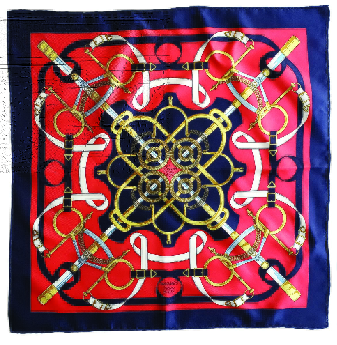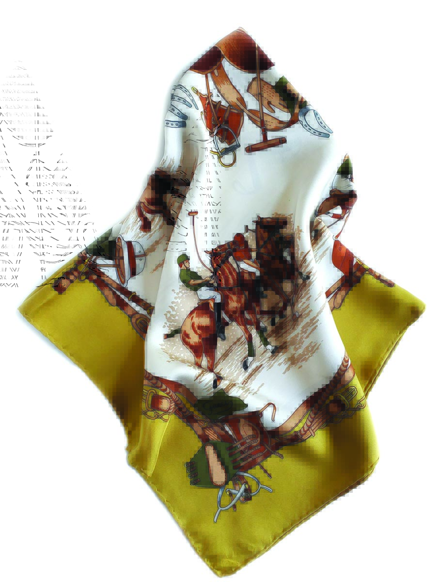 This Hermès scarf features a graphic design with a riding theme.