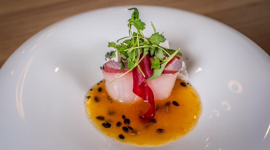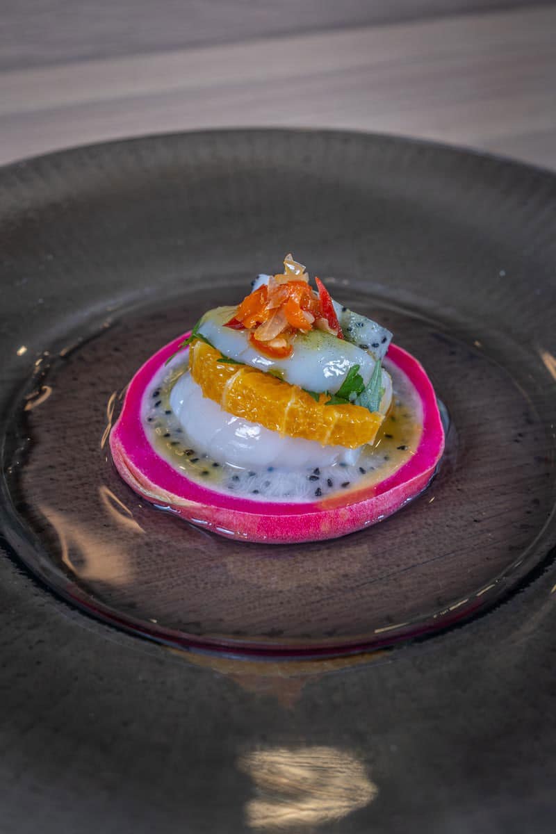 The first course of his omakase, for one, is raw scallops served atop a slice of dragon fruit, with a Balinese sambal chili and wasabi miso, for an explosive flavor combination of sweet, peppery and salty.