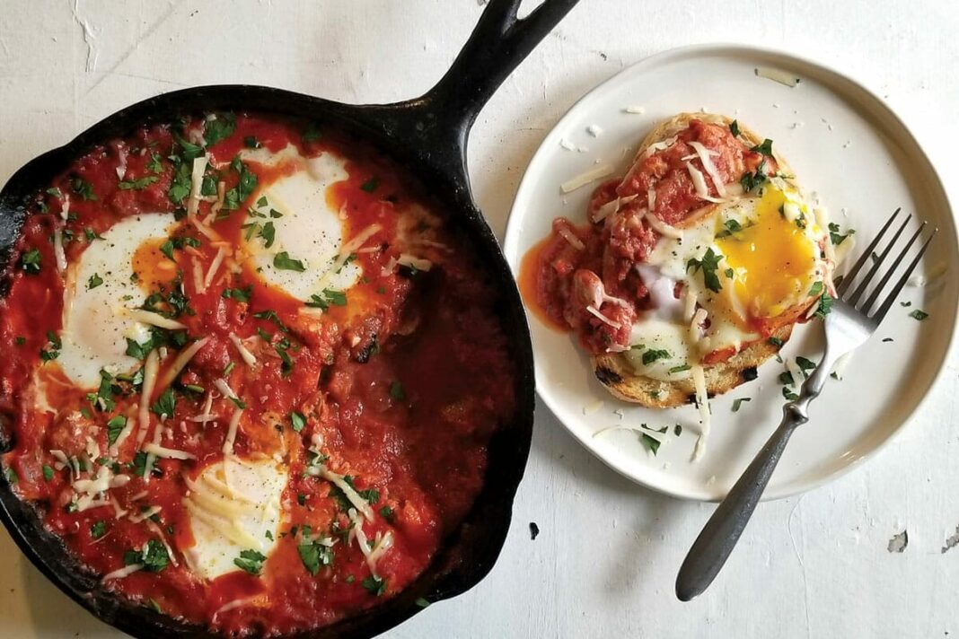 Hands down, the cast-iron skillet is the most versatile piece of equipment in any cook’s arsenal. It’s really the only pan you need, whether your recipe calls for sauteing, searing, grilling, braising, frying or baking. Properly seasoned, it’s a snap to clean. For the ease of a one-pan dinner, a cast-iron skillet is perfect for chicken potpie, paella, pizza and jambalaya. For dessert, think apple crisp, blackberry cobbler, bread pudding and any kind of upside-down cake. A brunch favorite that also makes a fine Sunday-night supper is Eggs in Purgatory, a dish that adapts easily to a variety of flavor profiles — from Italian (featured here) to a chile-studded Mexican take — with just a few changes in spices, herbs and vegetables. It works beautifully in the cast-iron skillet because the heavy pan (this recipe calls for an 8-inch one) allows you to create a thick tomato sauce that acts as a hot, bubbling cushion in which the eggs are suspended to cook. What’s more, the skillet moves simply from stovetop to oven to table. Serve for brunch with a side of grapefruit brulee or a bowl of fresh fruit with whipped cream; for an evening meal, toss a butter lettuce salad with baby tomatoes, green onion and an herbed vinaigrette as your side.