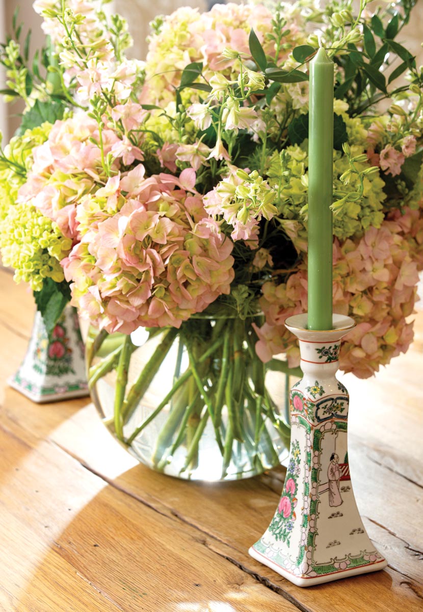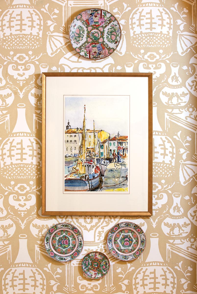 The designer’s collection of Rose Medallion porcelain includes everything from bowls to spoons to scallop-edge plates. Pieces are on display in the china cabinet and on the walls.