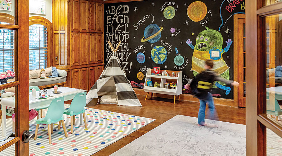 But the splashiest statement space resulted from keeping the chalkboard of the former occupants but re-envisioning it for the kids courtesy of sign painter and artist Don Smith and retro poster designer Ashley Moran, as chalk is not Smith’s usual medium. Other than shipping delays, the project came together with ease, Jessica says. “Melissa gave us a lot of freedom to do what we wanted to do to combine fun and functional.” And Stacie met her goal to merge classic with child-friendly by making all the smile-inducing elements pop. She says, “We wanted the bones of the space to be serene so the fun elements would shine.” The result says happy family. Melissa and her husband feel as comfortable in the space as the kids do. “Everyone plays on the floor at some point.”