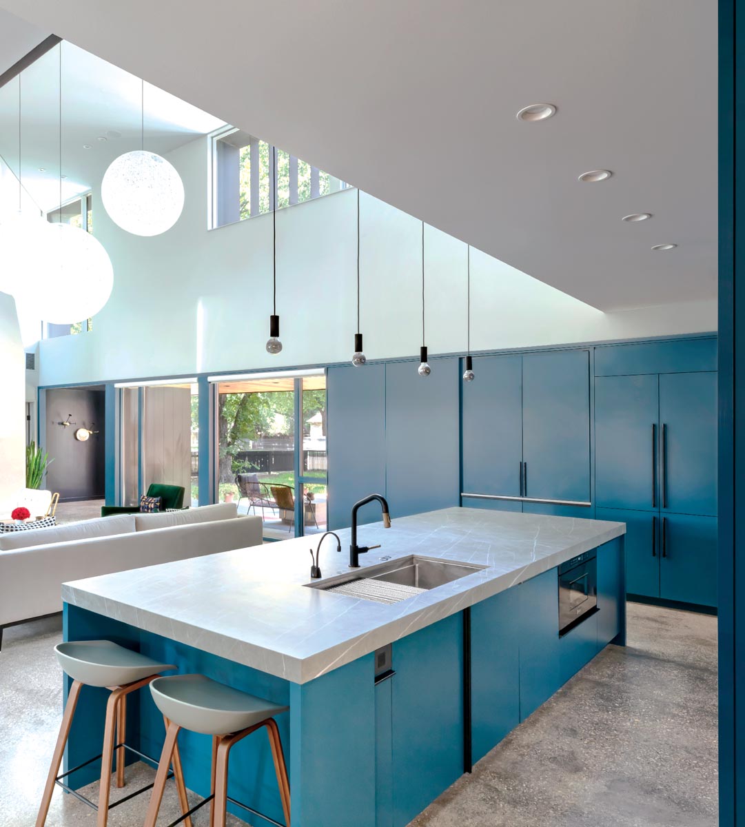 Timothy Ballard, a designer with A. Gruppo, suggested the bold teal on the kitchen cabinetry. “We told him we wanted some color and he picked the perfect ones,” says Azeem. Ballard also worked closely with the homeowners on other design details.