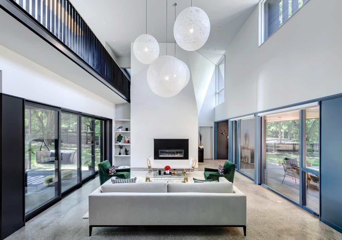 “We definitely wanted light and connections to the outdoors, too,” says Azeem. Modern elements — polished concrete floors, a custom steel floating staircase, lots of built-ins — create a sophisticated but welcoming home for a family with young children.