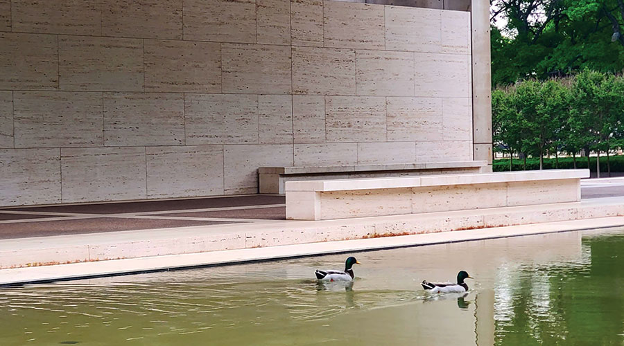 This gives new meaning to the baseball phrase “ducks on a pond.” The winged creatures who enjoy the solitude of an early morning swim in the Kimbell Art Museum’s reflecting pools are yearly visitors and a welcome sight to the Kimbell’s staff. We’ve spotted males as well as a female (or two). Honestly, we can’t quite tell them apart. They’re rather shy, preferring humans observe them from a distance. So, whenever we see them paddling about, we stand back to watch the action, rather than make an unforced error that would end the game.