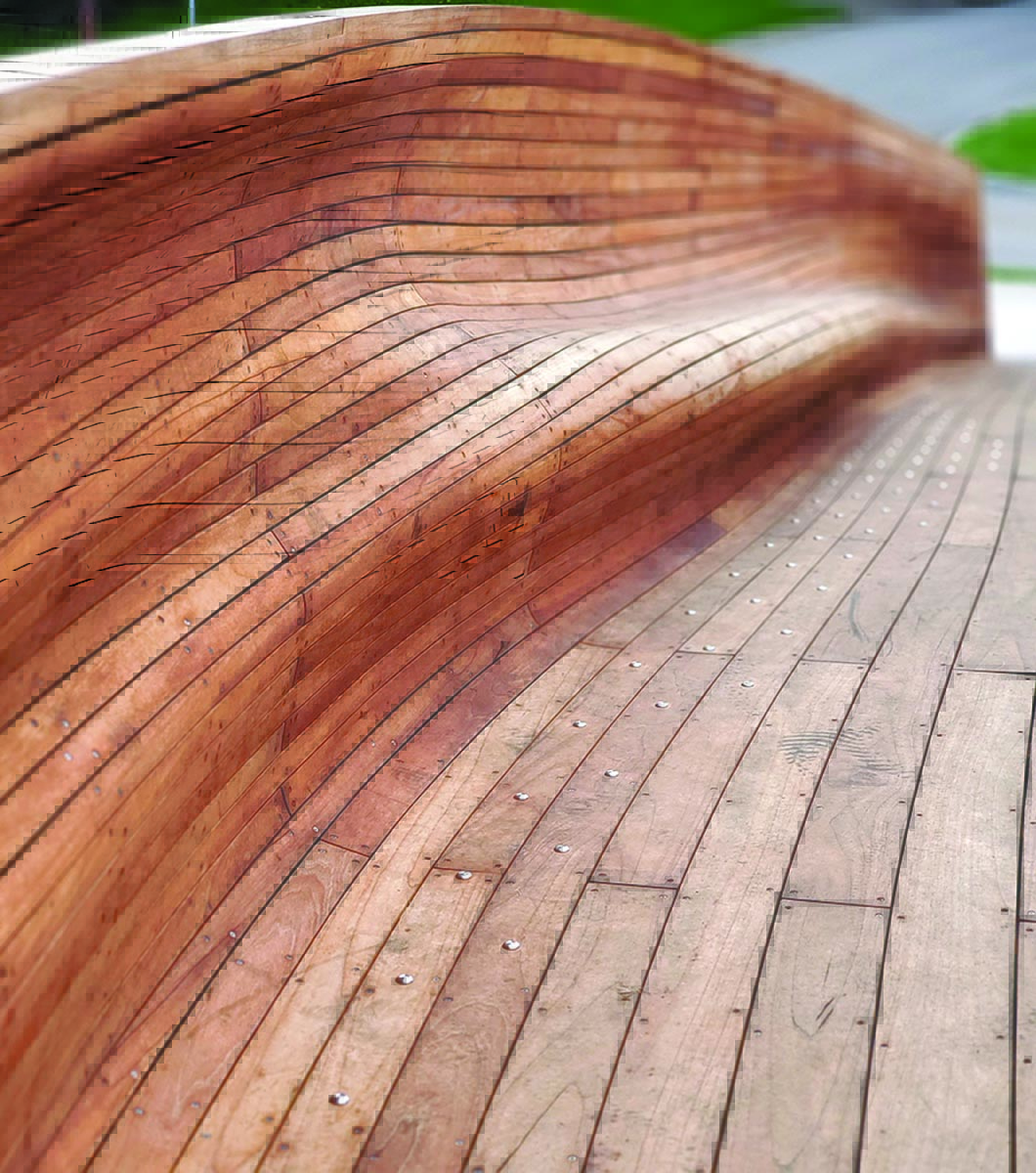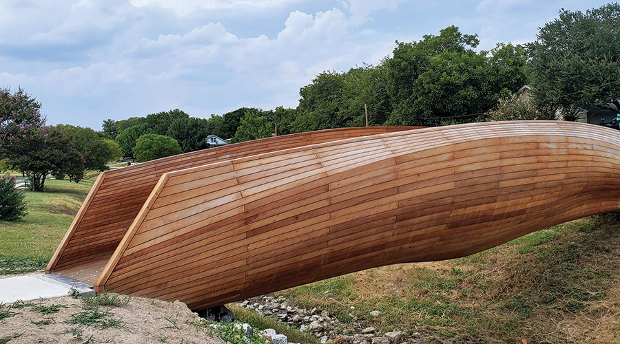 While, typically, we like our Photo Finish to be a single shot, this one was a challenge. Portland artist/architect Volkan Alkanoglu’s site-specific, ADA-compliant pedestrian bridge deserves a few images. As part of the Fort Worth Public Art program, Drift, located on Westcreek Drive, connects walkers, runners and cyclists in the South Hills neighborhood to the Trinity Trails. Alkanoglu was inspired by the natural formations in the rocky creek bed below. And, yes, it resembles a boat — it’s 58 feet long and 12 feet wide — and was constructed in the same manner with a steel skeleton sheathed in sanded Spanish cedar, still wonderfully aromatic on a mid-August visit. We were happy to discover the built-in benches — undulating wood offers a perfect perch to take in a cool breeze. Alkanoglu collaborated with fabricator Ignition Arts and Brownsmith Studios (both based in Indiana) on the design development and project management, and Drift was installed in late June. While the culvert typically is dry, crossing over from one path to the other is now much more inviting.