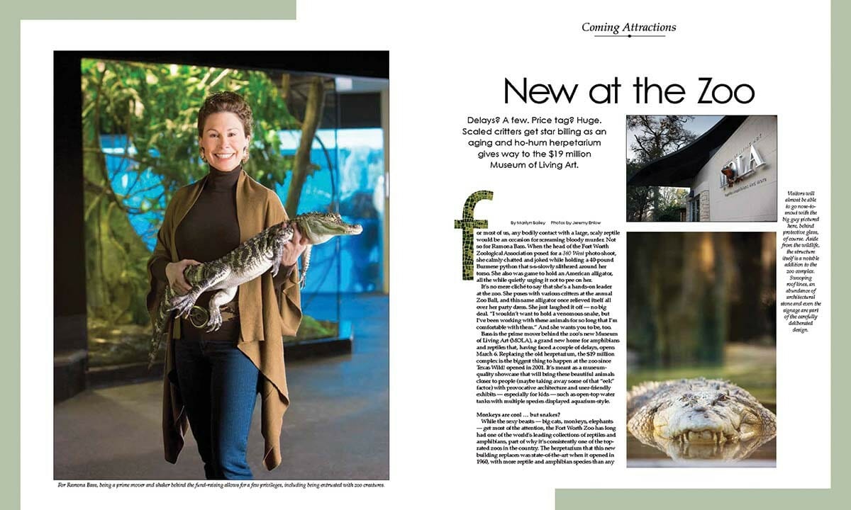Beauty of another kind is celebrated at institutions devoted to wonders of the natural world. We won a rare interview with Ramona Bass, a great patron of the Fort Worth Zoo, who showed us around the new reptile exhibit known as MOLA, the Museum of Living Art, as it opened in all its slithery glory. We loved how she calmly held a 40-pound python and then an alligator for the photographer. But there’s always something new at the zoo. Last year, we covered the first stage the Wilder Vision re-imagining of its exhibits: The 10-acre African Savanna opened with an integrated habitat designed to nurture giraffes, hippos, zebras, springboks and more, and to give visitors a richer, more meaningful experience.