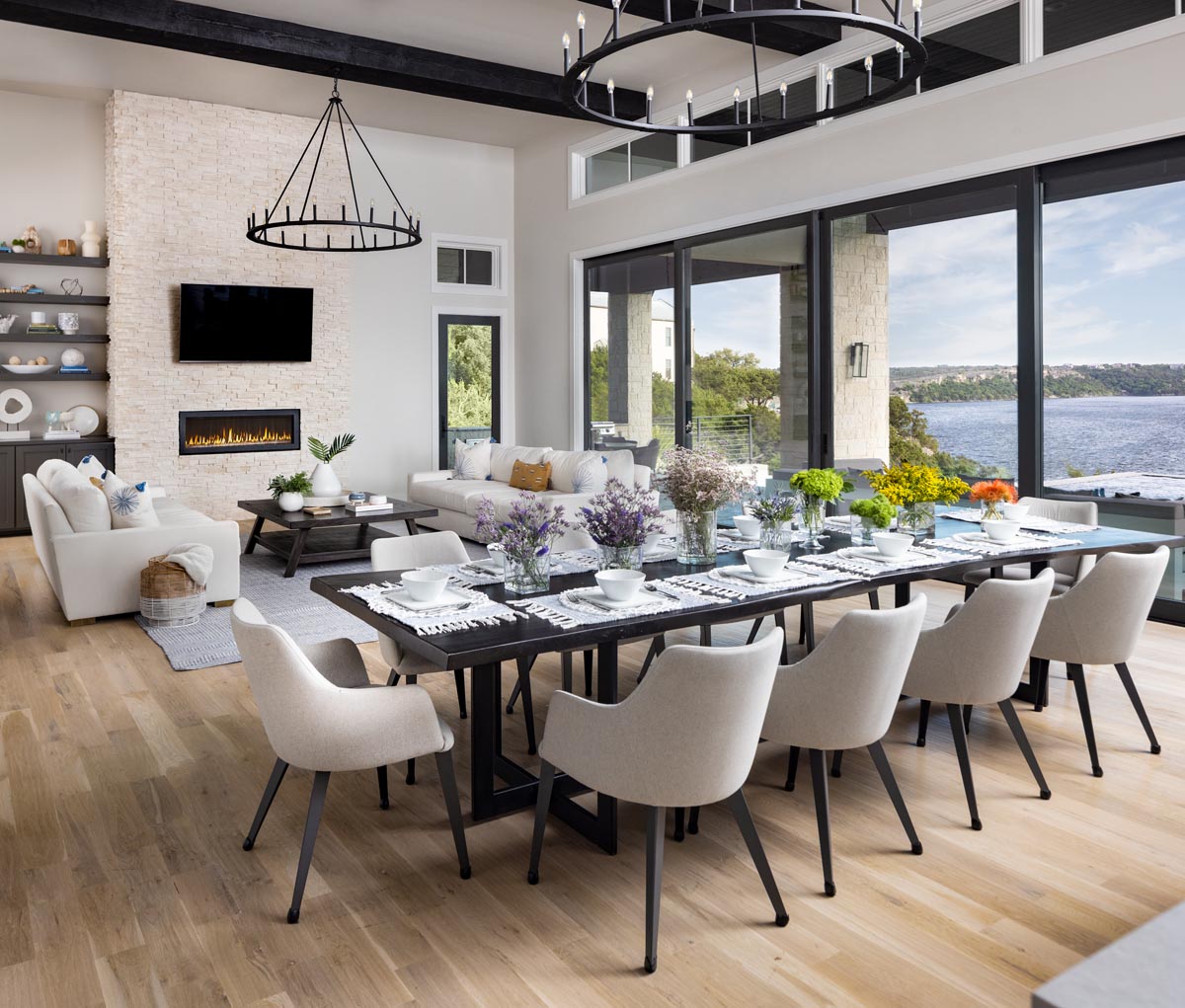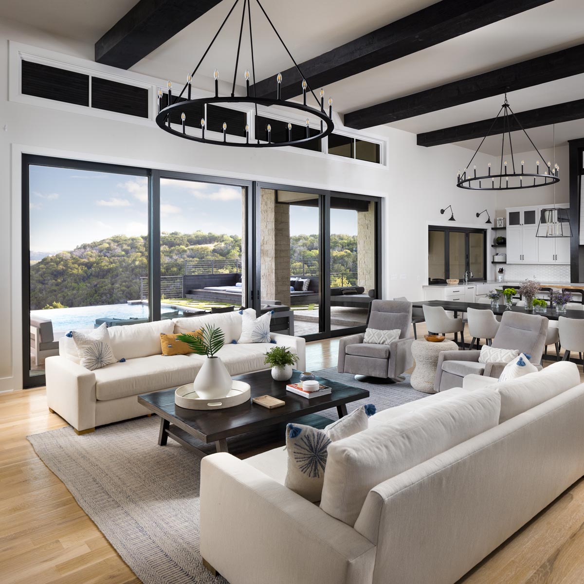 McNutt chose a neutral palette of whites, creams, blacks and grays and added contrast with black woodwork, cabinetry and metal accessories such as the pendant lights and contemporary chandeliers. Floors throughout the home, except for the bathrooms, are 5-inch white oak planks; decorative beams on the 16-foot ceiling of the family room and kitchen are ebony-stained white oak. The beams were distressed by hand scraping and beating them with chains. “We roughed them up a little, just to give them texture,” McNutt says.