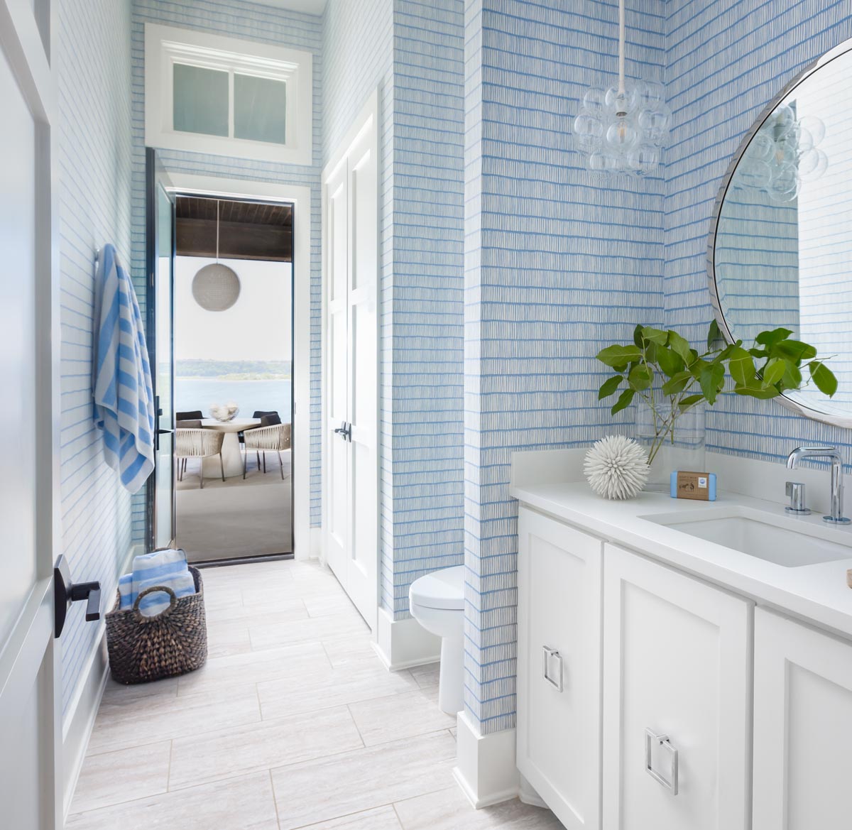 A major piece of the clients’ design inspiration is a periwinkle glass lamp they already owned — a second one was added to the lake house — but beyond that, the wife wanted minimal color. McNutt worked the lavender-blue color into the pantry and the utility room, painting the doors in Sherwin-Williams Celestial. In a bathroom that sits just off the patio, the color pops in the Christopher Farr Crochet Cobalt wallpaper. “That was the only color I could get her to commit to,” McNutt says. “We embraced it.”