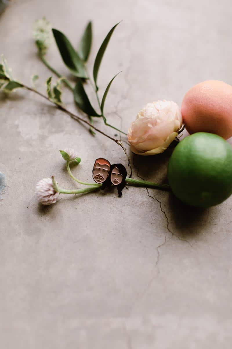 Other unique elements included their cake topper, which spelled out their initials in copper piping, and the Scrabble letter tiles used on tables. The tiles spelled out directions, the couple’s names and words like “love” and “forever.” They also created a custom pin of their faces as favors for guests.