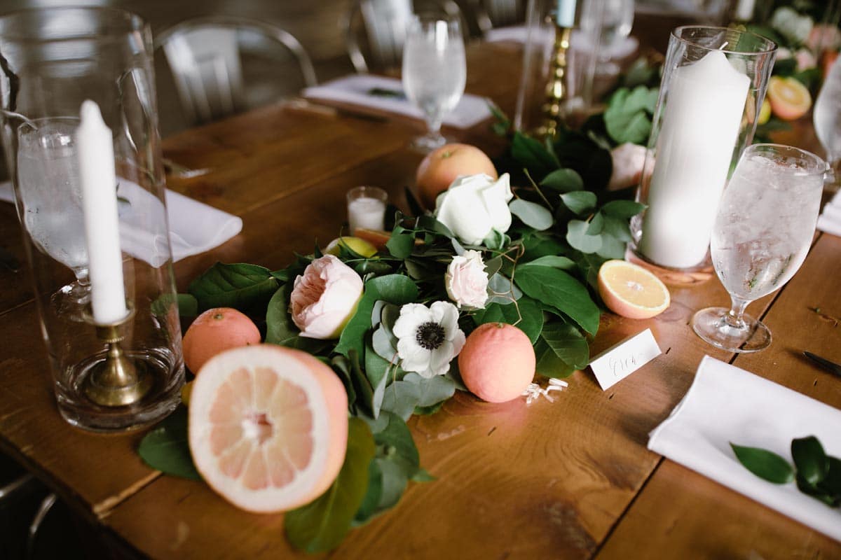 Citrus fruits were peppered throughout the venue for a creative spin on the décor—oranges popped against the greenery of the tablescapes. And the head table was framed with the arches used in the ceremony.