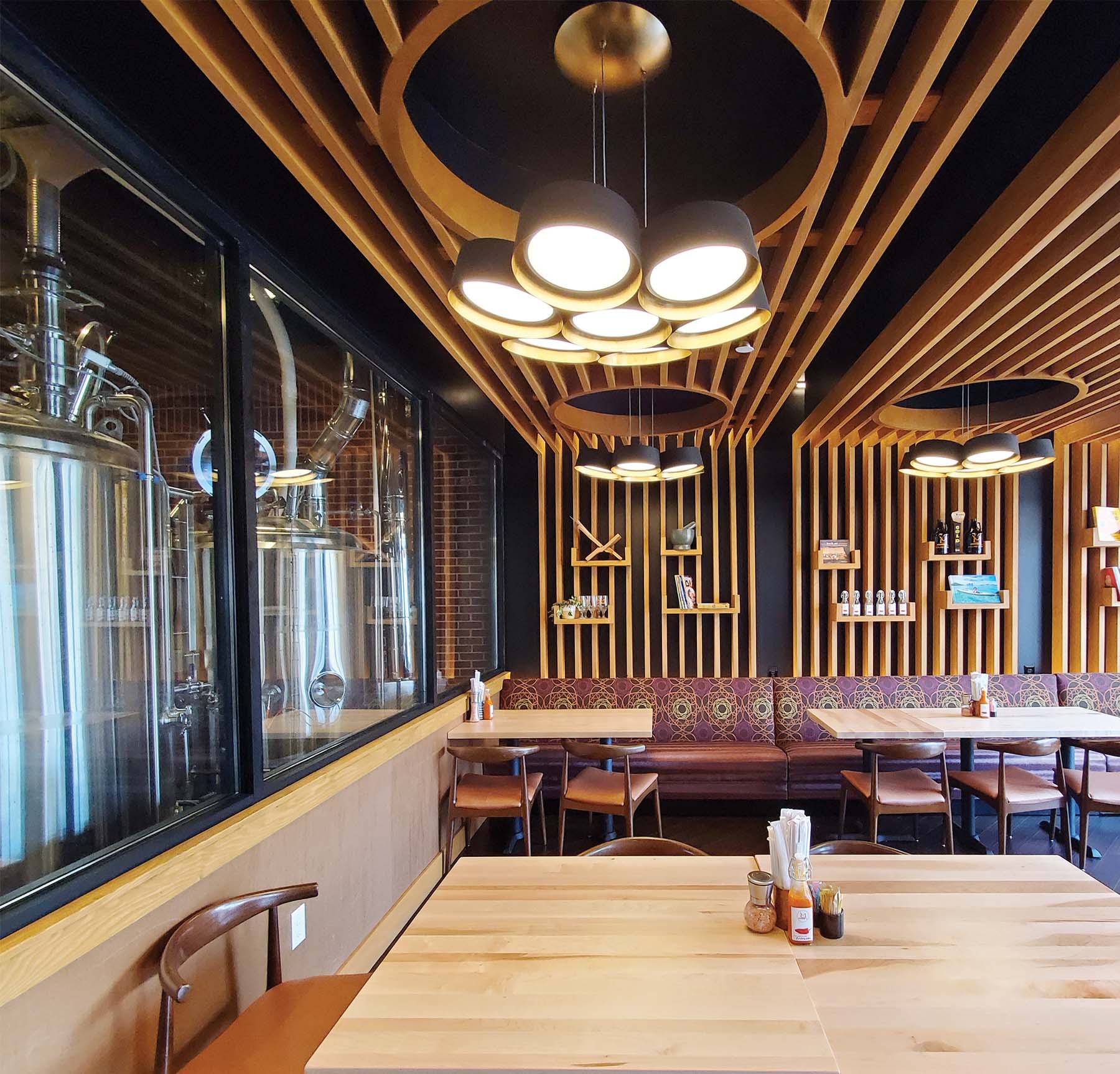 Chef/owner Braden Wages has enlarged his popular Asian restaurant with the addition of a spacious dining room filled with windows inside and out. Diners have a view of the new brewery filled with metal kegs and gleaming stainless tanks, which will allow Malai to triple its craft beer production. In the dining room, sliding doors are available to create a private space for large parties or special events. Jones Baker Interior