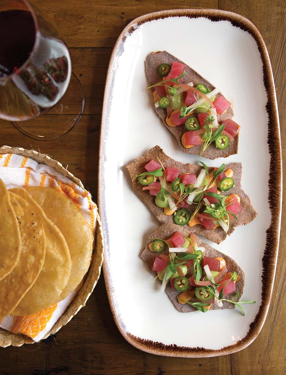 Rotisserie At long last, Sarah Castillo launches her second chapter. The Fort Worth native and Taco Heads owner has long wished to honor her mother’s cooking on a broader scale — and now does so at a bistro bearing mom Christina Castillo’s nickname. Tinie’s offers an elevated version of Mexican home cooking from the kitchen of co-owner/chef Christian Lehrmann, starting with rotisserie chicken and crispy whole fish, among several dishes meant for sharing family-style. Trips to Mexico City helped the Castillo women and Lehrmann focus the menu, which includes empanadas as well as lighter options such as ceviche, tuna tostada and seafood cocktail. 97w architects redesigned the century-old building, whose brick walls and wood ceilings impart warmth to the two-story space, now rich with a vintage-yet-contemporary feel thanks to elevated design elements, from marbled wallpaper to modern light fixtures. The rooftop bar promises a menu of custom cocktails — such as the Ocho Uno Siete, a blend of mezcal, avocado, vanilla liqueur, lime juice and agave nectar — from business partner and noted local mixologist Glen Keely. Open from 4 p.m. Tuesday through Saturday at 113 S. Main St., Fort Worth, facebook.com/tiniesfw.