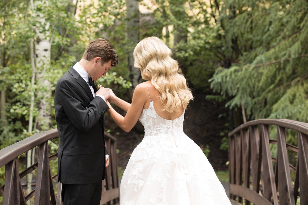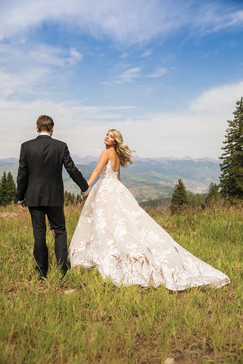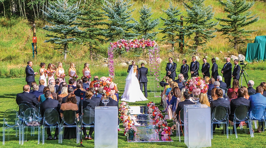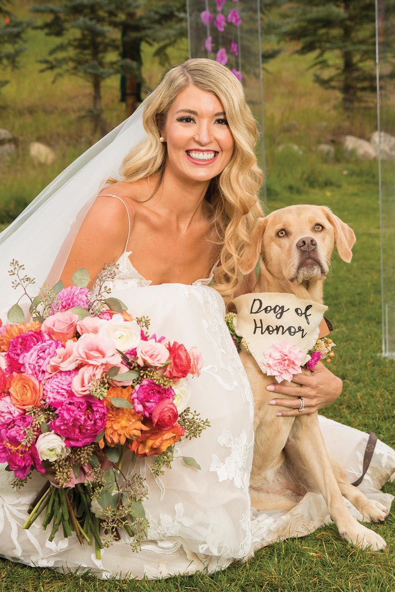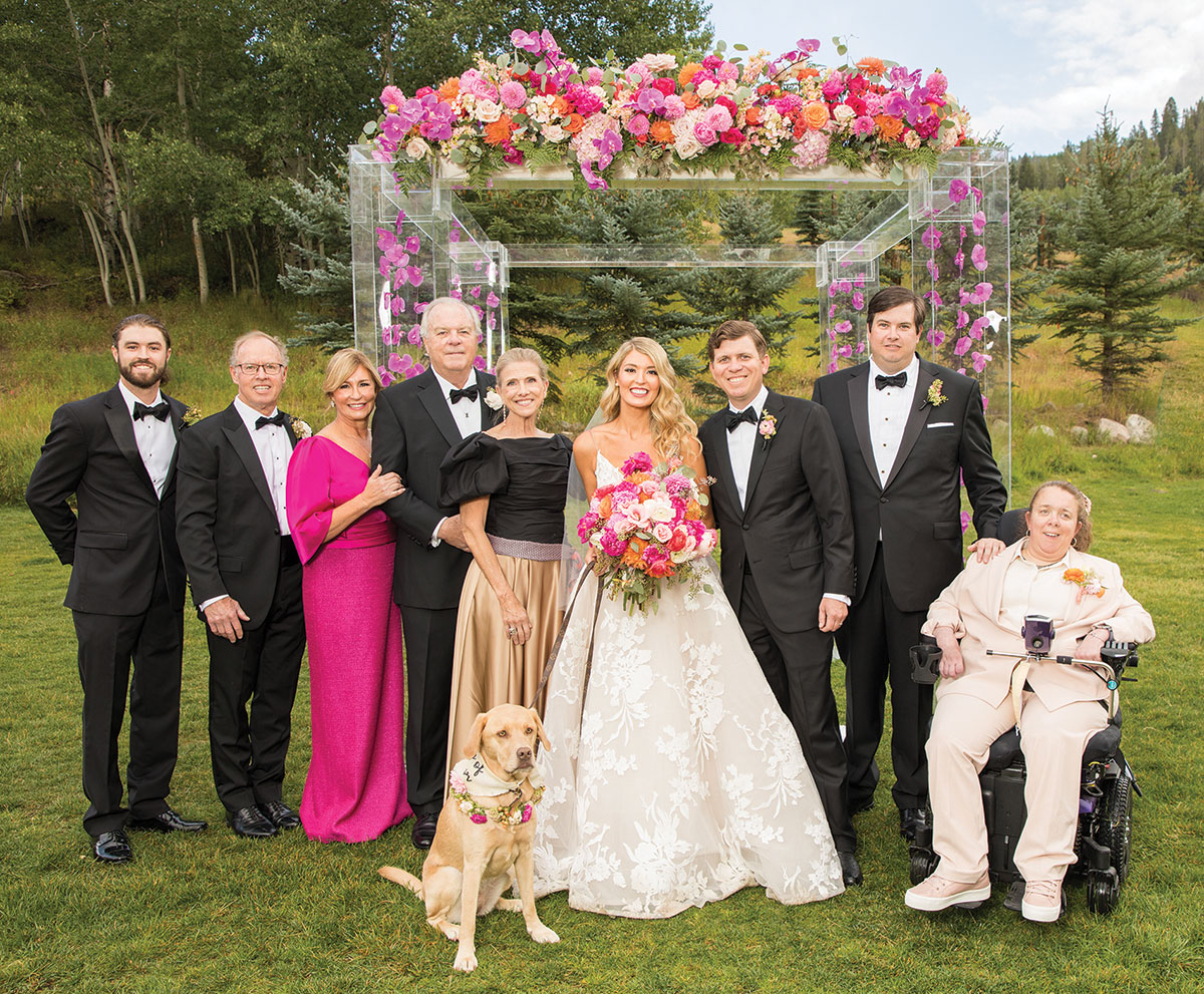 The stunning scenery — even without snow — and a chance to escape the Texas summer heat also made Beaver Creek inviting. The active couple love the outdoors, as does their dog, Stevie Nicks, a Lab who travels with them everywhere. The Park Hyatt resort also checked out as being ADA compliant for one of the bridesmaids — Sam’s adventurous sister, Jenna, who uses a wheelchair and was born with cerebral palsy.