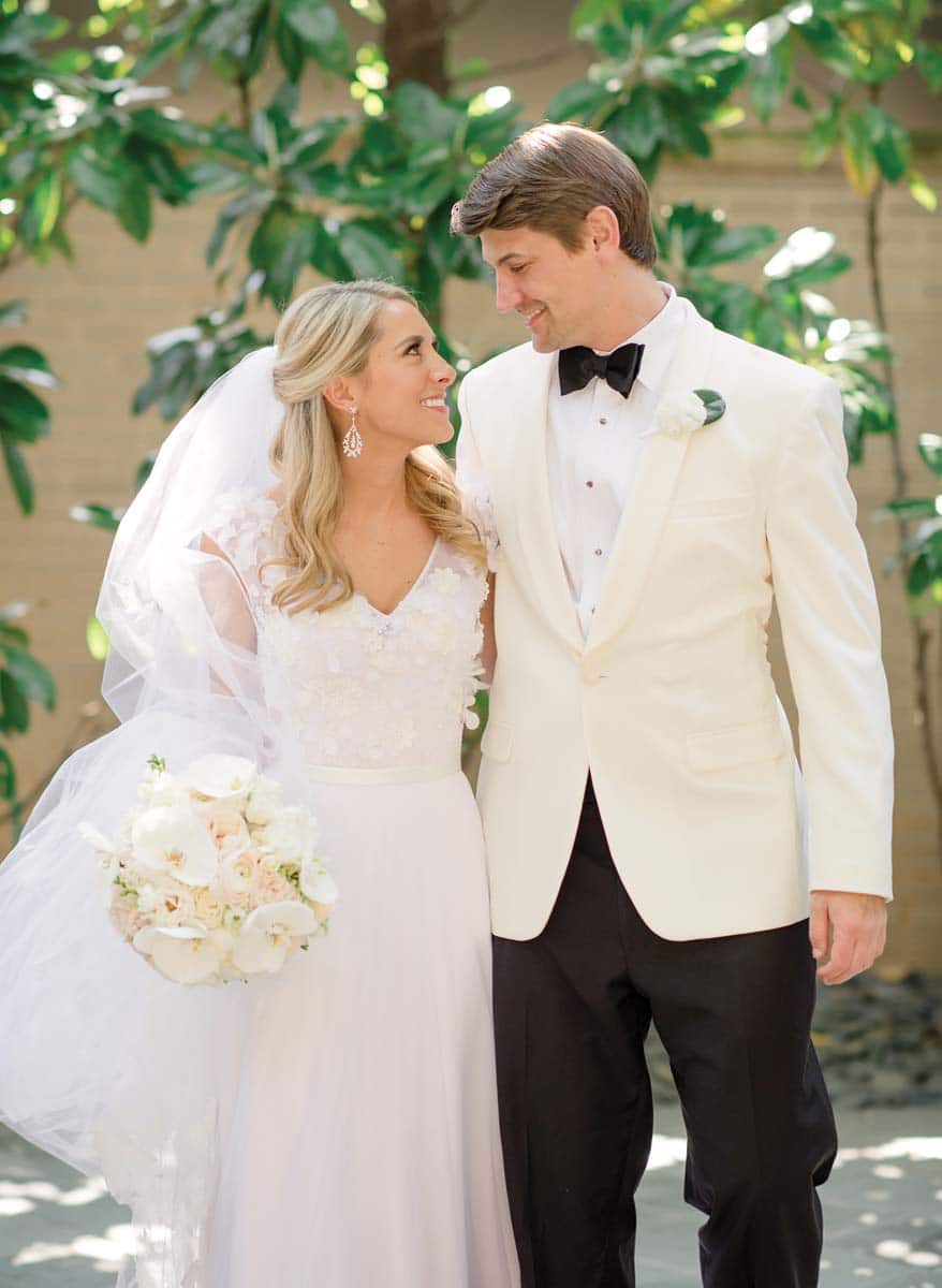 The couple first met at the University of Mary Hardin-Baylor in Belton. Ashlee, a freshman basketball player, left her research paper open on a library computer; Bryan, a senior football player, found the file and reached out to her through Facebook. Ashlee wasn’t immediately smitten, but as the two college athletes became friends, she started to notice that he could always make her laugh. It wasn’t until after he moved away for his football coaching career that their connection deepened; after two years of dating, much of it long distance, they’d begin planning their wedding with the help of Lucia Bitnar of Foster Blue.