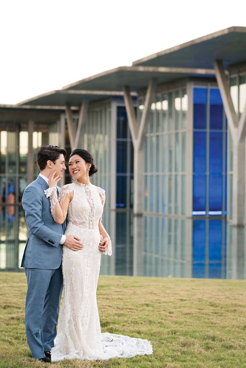 “Our three most important things were food, dancing and having close friends and family there,” Tran says. They celebrated at the Fort Worth Botanic Garden and the Modern Art Museum of Fort Worth. They relied on the talents of wedding planner Tami Winn, who, in addition to orchestrating the party, took the lead on the florals and the autumnal color palette.