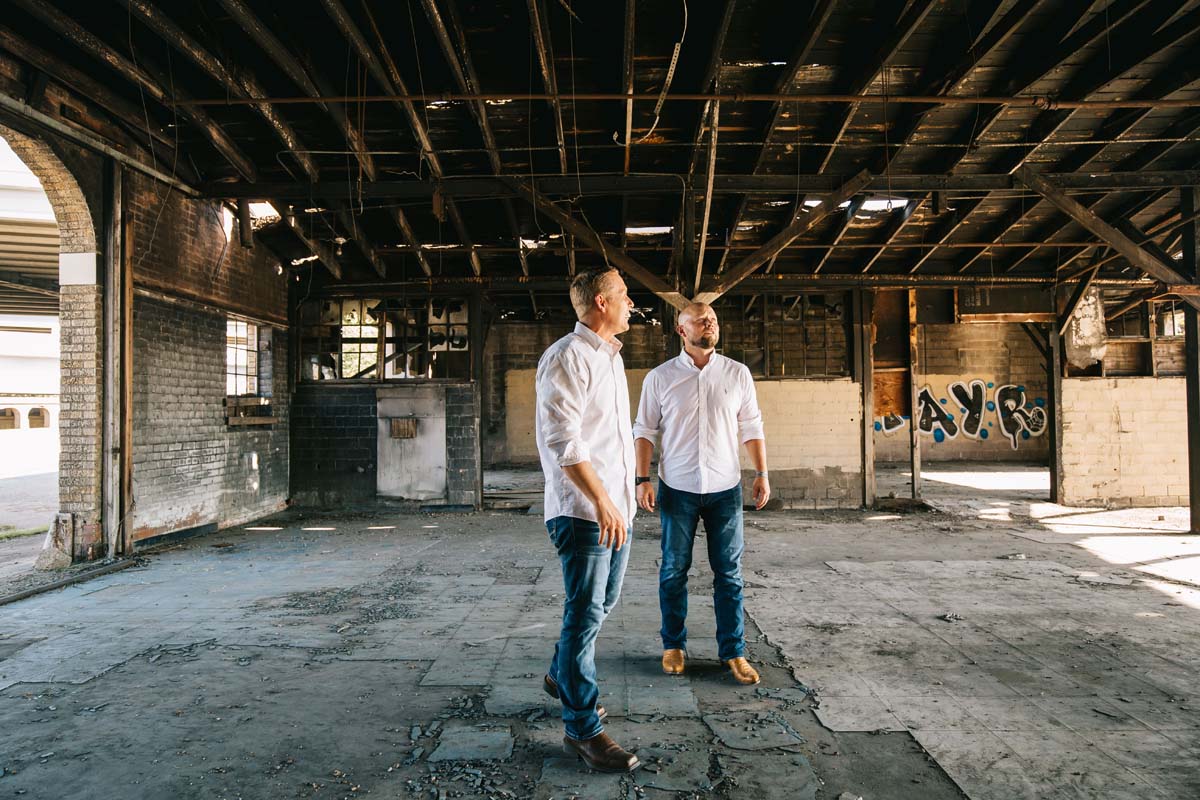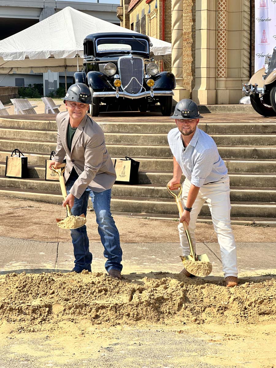 Cousins Jess Green and Kyle Wilks (left to right), senior vice president and president of Wilks Development, respectively, broke ground in June on the $54 million restoration of the old Public Market. The project will include a luxury senior independent living complex. Photo courtesy of Wilks Development