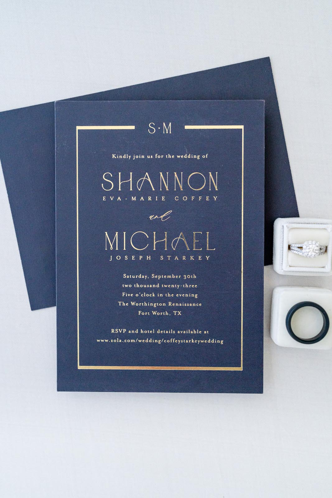 The Worthington Renaissance Fort Worth Hotel’s rooftop terrace was the perfect setting for Shannon Coffey and Mike Starkey’s rustic and elegant wedding, complete with blush, blue and gold florals from Blushington Blooms. After a meaningful first look, the ceremony featured a touching sand ceremony uniting Shannon, Mike and Shannon’s son, Carter, as a family. Highlights of the lively reception included personalized wedding cakes from Sugar Bee Sweets and memorable mother/son dances. Join us for an exclusive Q&A with the bride as we dive into the details of their special day.