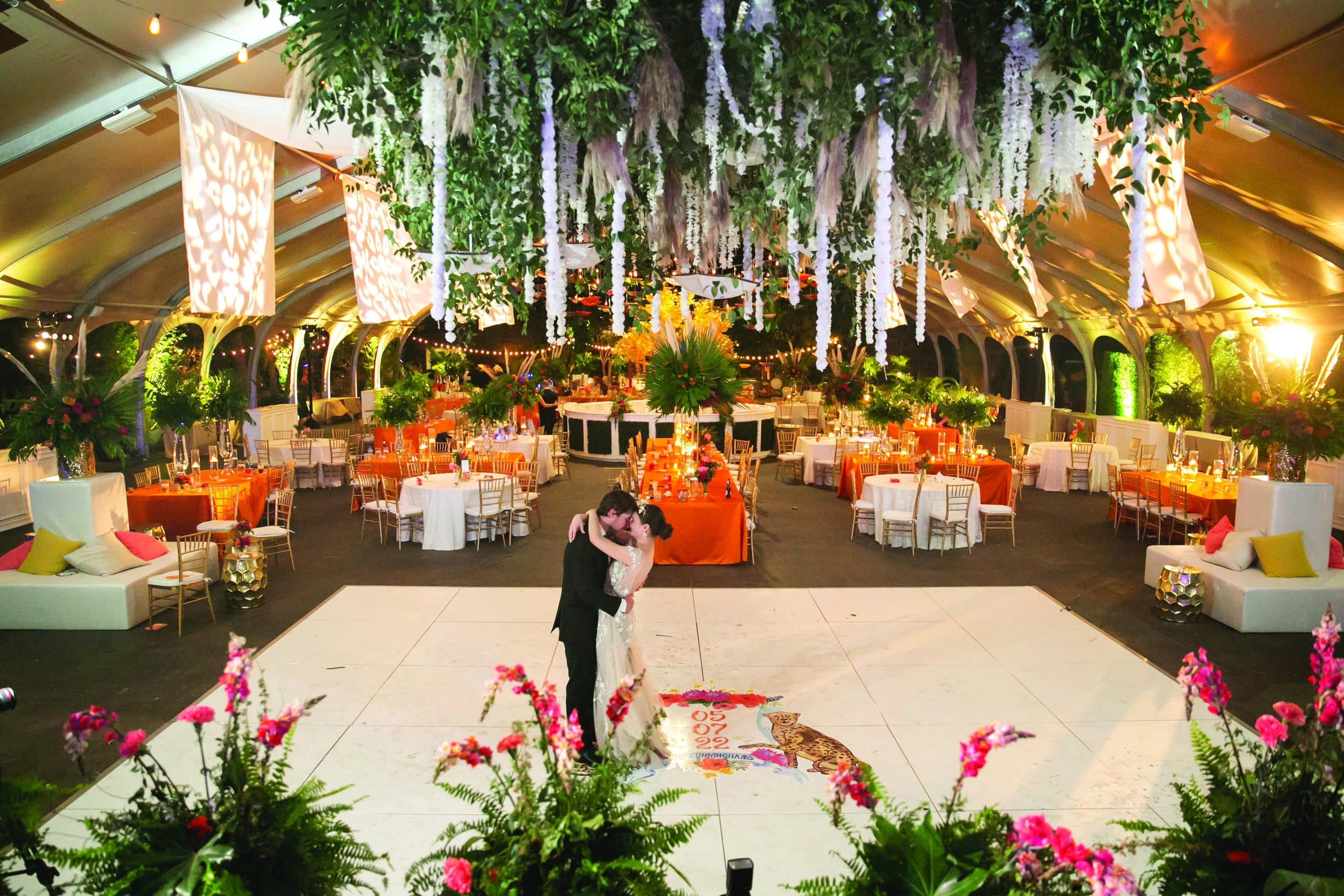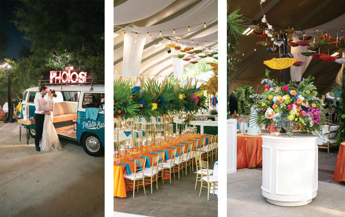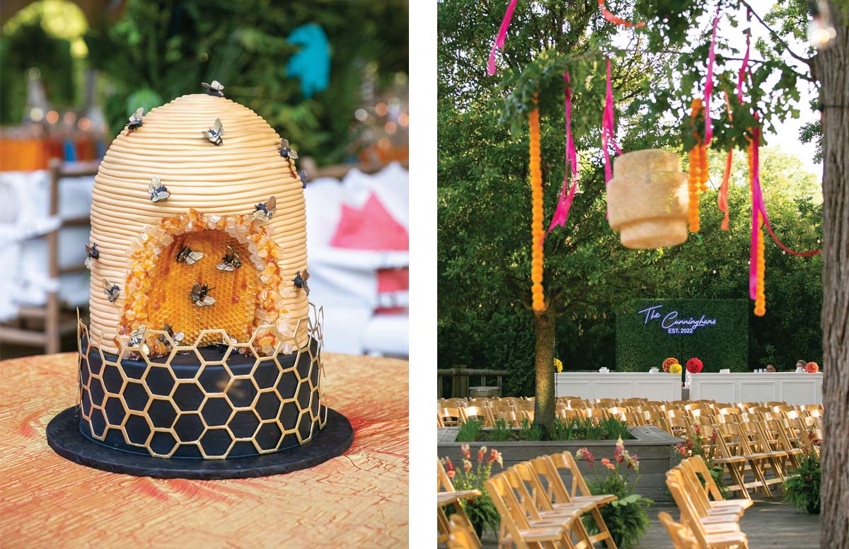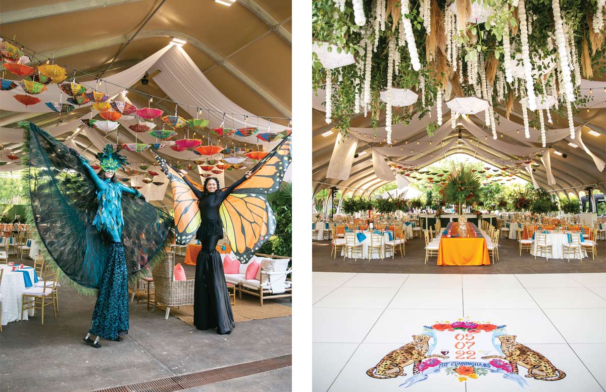 From epic, vibrant floral arches and dramatic statement pieces to dreamy string floral and bright ribbon hanging from the trees, the big-day blooms were nothing short of a masterpiece, thanks to Camellia Farm Flora. After the ceremony, the newlyweds and guests enjoyed a cocktail hour amongst giraffes and stilt walkers, dinner under three hundred brightly-colored silk umbrellas which hung under the reception tent, a 10-piece band that played hits across the genres, a beehive groom’s cake inspired from the couple’s hobby as beekeepers, and more. A 1949 Rolls Royce whisked them away from the surrounding sparklers and crowd of well-wishers. Next stop, a dreamy honeymoon across Istanbul, Santorini and Athens. Favorite moment? “Hearing him say his vows looking straight into my eyes while holding back tears,” Ryann says. “I’ll never forget it.”