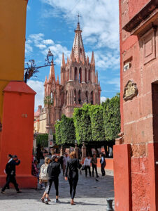 Pedestrians near San Miguel de Allende’s La Parroquia de San Miguel Arcángel iconic parish church.