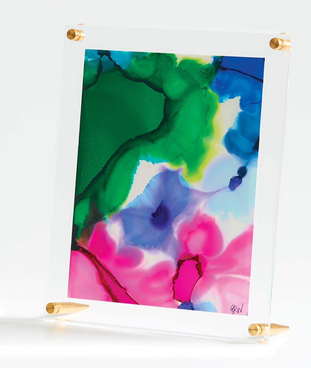 Ginger Walker Art Look for mixed media canvases along with small prints in desk frames; gingerraywalkerart.com