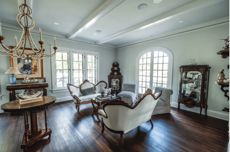 Marilyn has added several personal touches throughout the home, such as MacKenzie Childs decor in the kitchen, a new, round dining room table that can seat up to 12 and a cabinet with antiques from her family’s store in New Orleans.