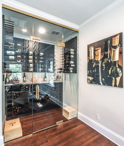 The wine cellar is behind glass doors. Each wall behind the glass door has a wine rack, and the area underneath the bar offers more room for wine.