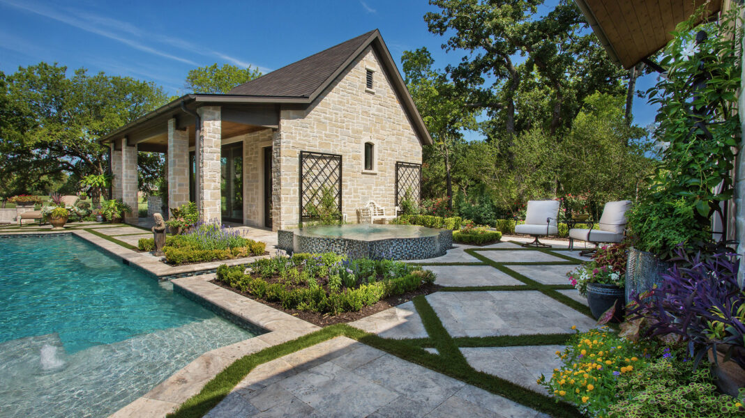 A corner lot at 112 Woodglen Court allowed Gina and Shawn LaRocco to choose sun-loving plants, using flowering perennials for colorful displays. The manicured landscape style incorporates the home’s pool and gazebo with textured plants.