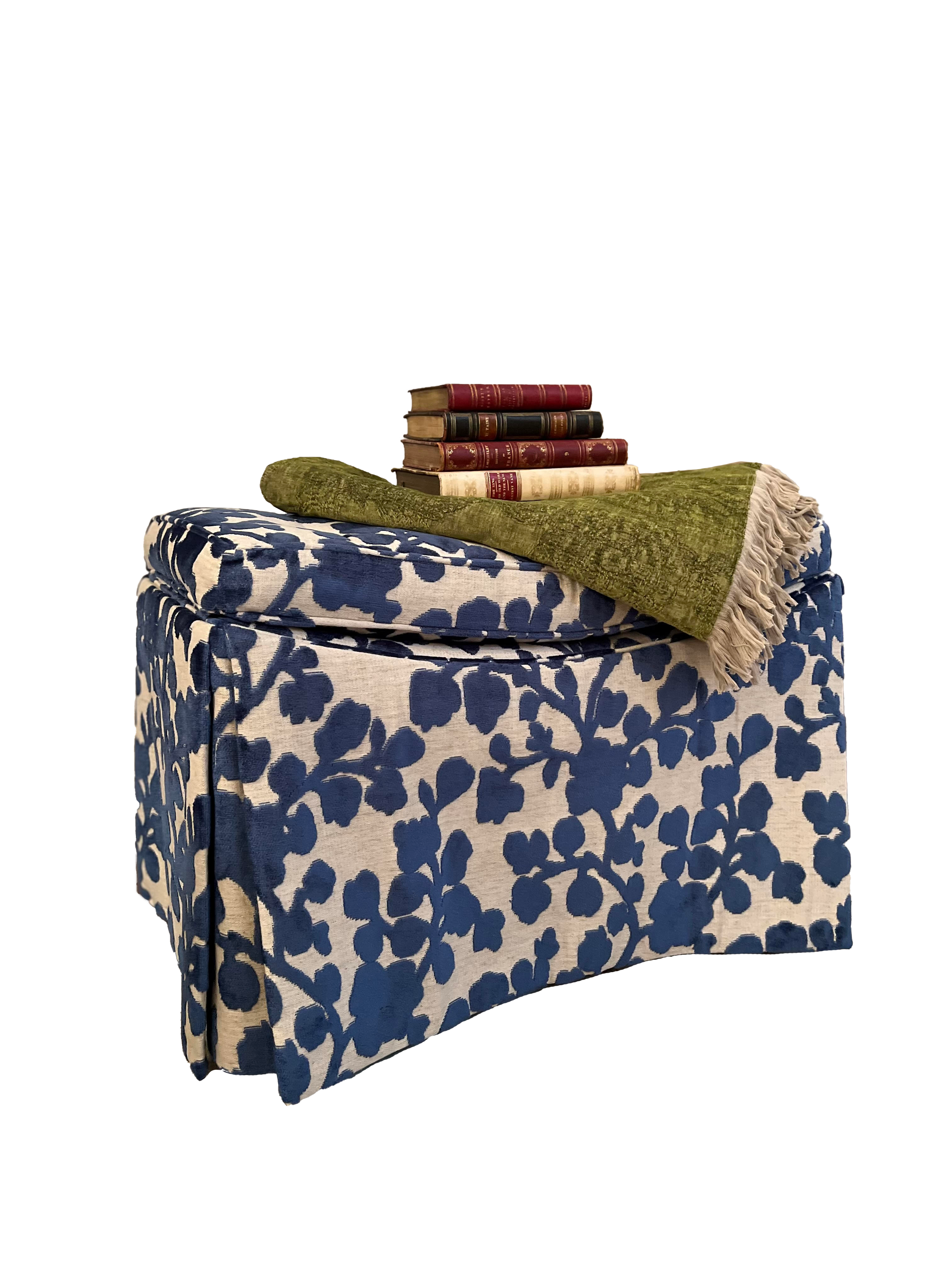 Muirfield Blue Ottoman by Sherrill Furniture, Savery Throw Blanket in 52 green, vintage books