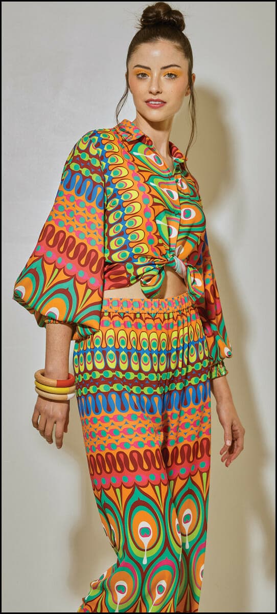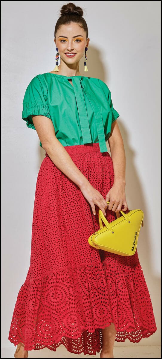 Warm weather calls for hot colors such as this emerald Fabiana Pigna cotton blouse, $310, and Ulla Johnson eyelet skirt in vivid fuchsia, $645, both from You Are Here. Balenciaga Triangle bag, $1,790, Neiman Marcus, adds a vivid pop of yellow; raffia and beaded bird earrings, $52, Lola + Lina, add a tropical touch.