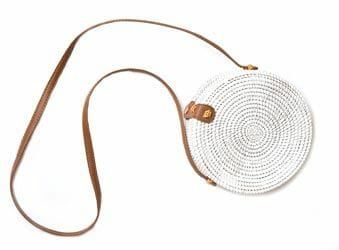 Wicker handbags are back in full force this season. We found this canteen-style bag in white with a leather strap, $55, at Beehive.
