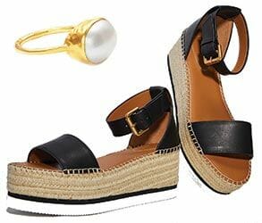 Slip on a Julie Vos Honey slender stacking ring in pearl with 24-karat gold plate, $110, Lawrence’s; or, See By Chloe platform sandals feature touches of leather and jute along with comfortable rubber soles. $215, Stanley Eisenman Fine Shoes.