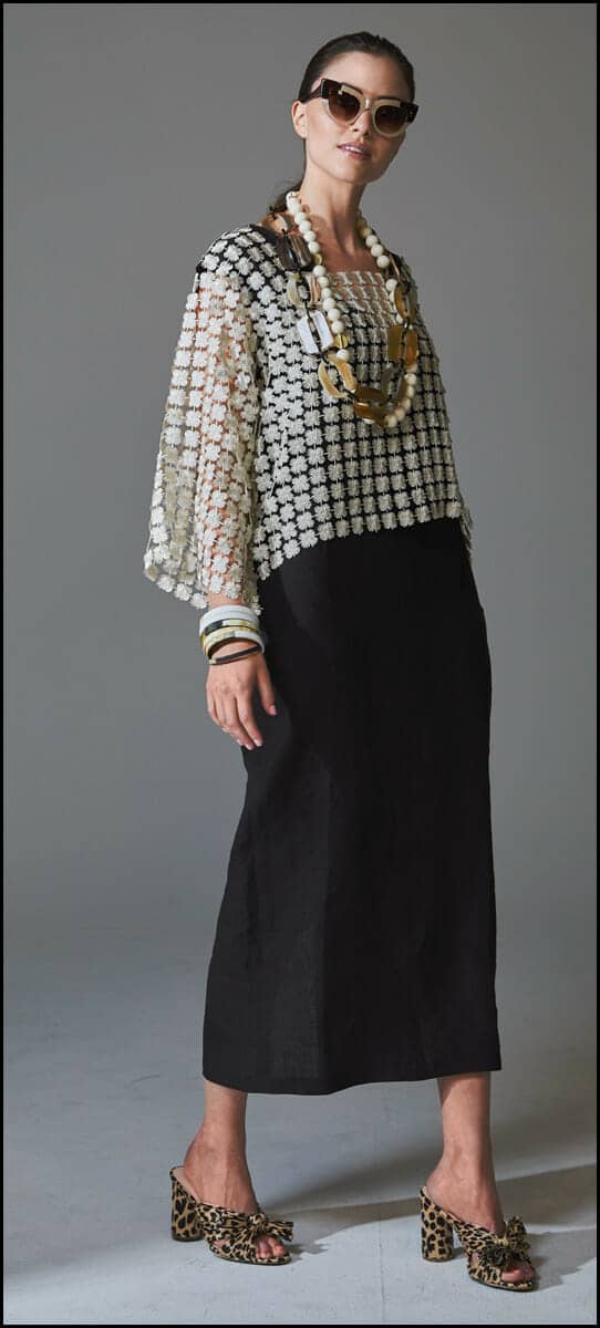 Mara Hoffman’s sleeveless shift in hemp features a deep V neck and pockets, $450, You Are Here. For a little extra coverage, we added a woven top in a metallic taupe, $75, LTO. Finish things off with neutral accessories including cat-eye sunglasses, $60, LTO; bead-and-brass necklace, $88, and horn necklace, $135, both from Lawrence’s; Vivo horn bangles, $94 for the set, and Loeffler Randall leopard mules, $395, You Are Here.
