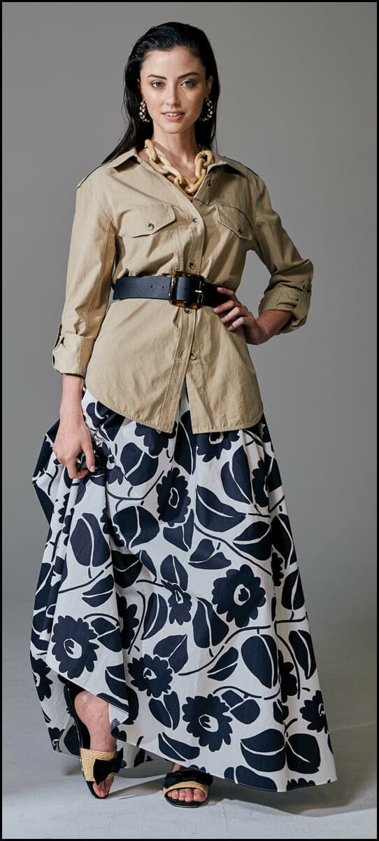 Piazza Sempione dirndl-waist skirt in a bold black-and-white floral pairs with everything from your favorite white shirt to a slim-fit T. $695, Neiman Marcus. We like a touch of khaki with this Brochu Walker shirt jacket in a soft cotton twill, $318, You Are Here. Belt it or tie at the waist. Accessorize with a chunky wood necklace, $77, LTO; and crystal-studded tortoiseshell hoop earrings, $65, J.Crew. Prada’s straw flats embellished with a satin bow add casual polish, $650, Neiman Marcus.