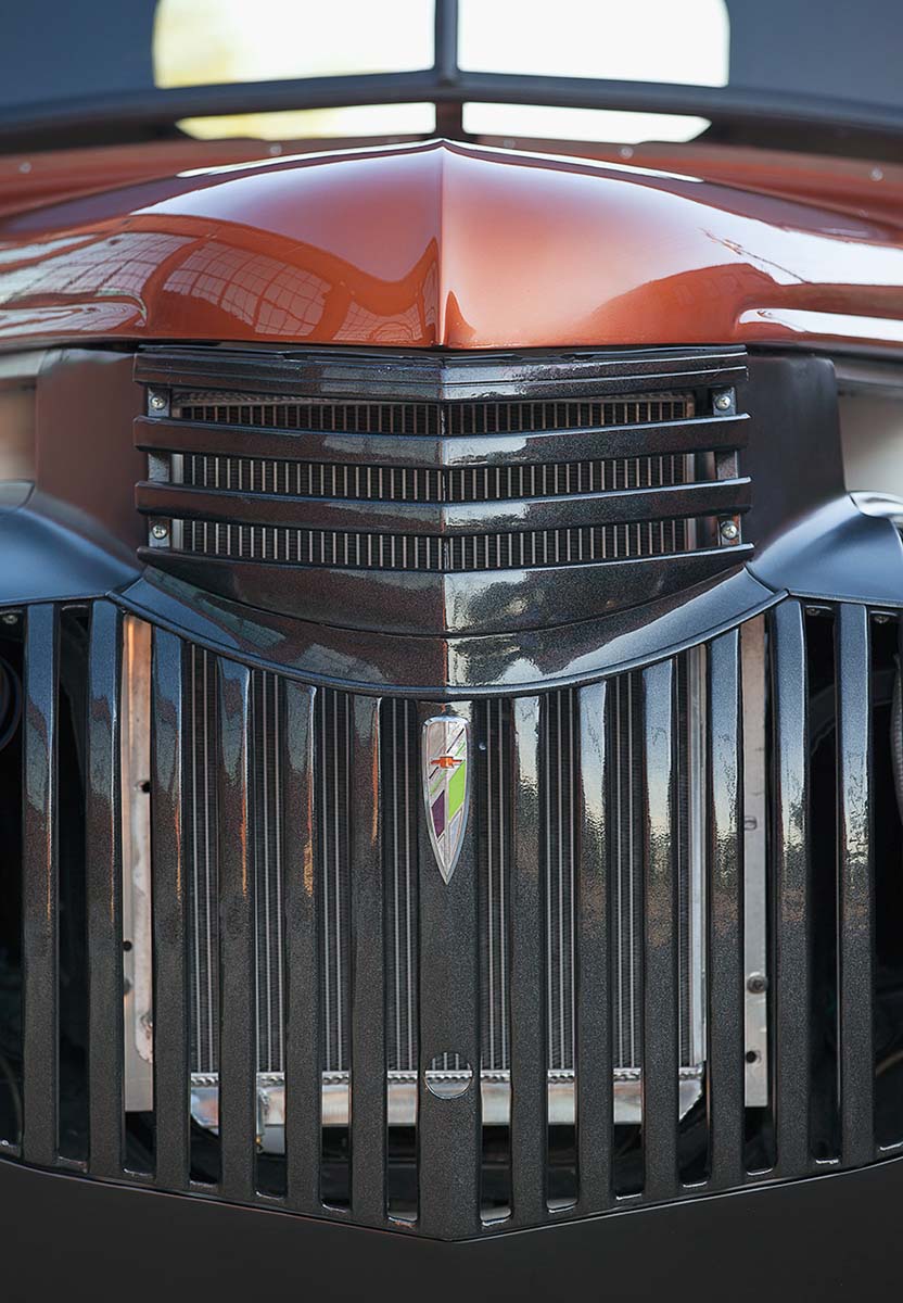 Scott McConnell’s project truck, a 1946 Chevy, has been worth the wait. “I like the way it sounds. I like the way it looks.” The body, painted in a two-tone combo with metallic black for the grille, is all original. Design tweaks include suicide doors and a solid tilt-forward hood. McConnell retained the original Chevy emblem in the grille.