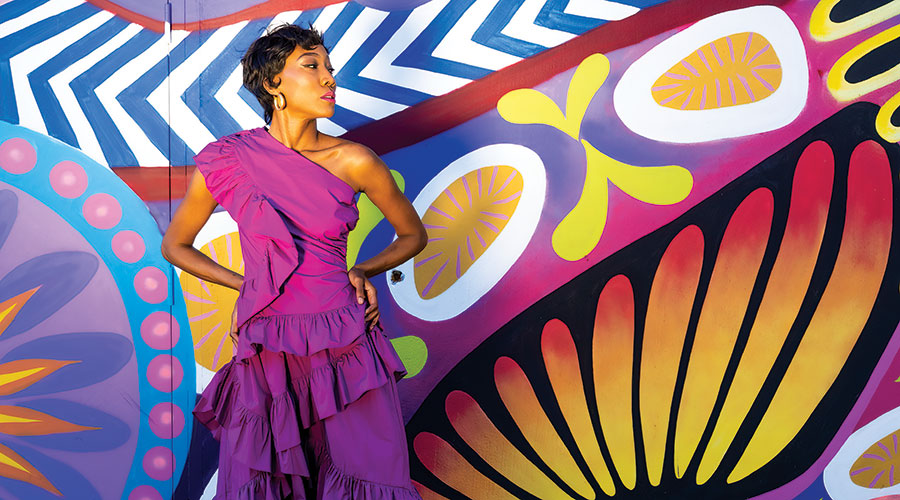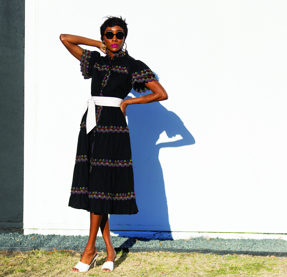 Dark hues have their place in a world of fuschia, cobalt and tangerine. CeliaB’s cotton/spandex Malik dress features colorful embroidery and is the perfect foil for bright accessories, $400, Monkee’s. The dress comes with a slim black drawstring at the waist, but we added a Marc Cain wrap belt in faux leather, $195, XAR Clothier. Krewe sunglasses, $275, You Are Here. (Shoes courtesy of the model.)