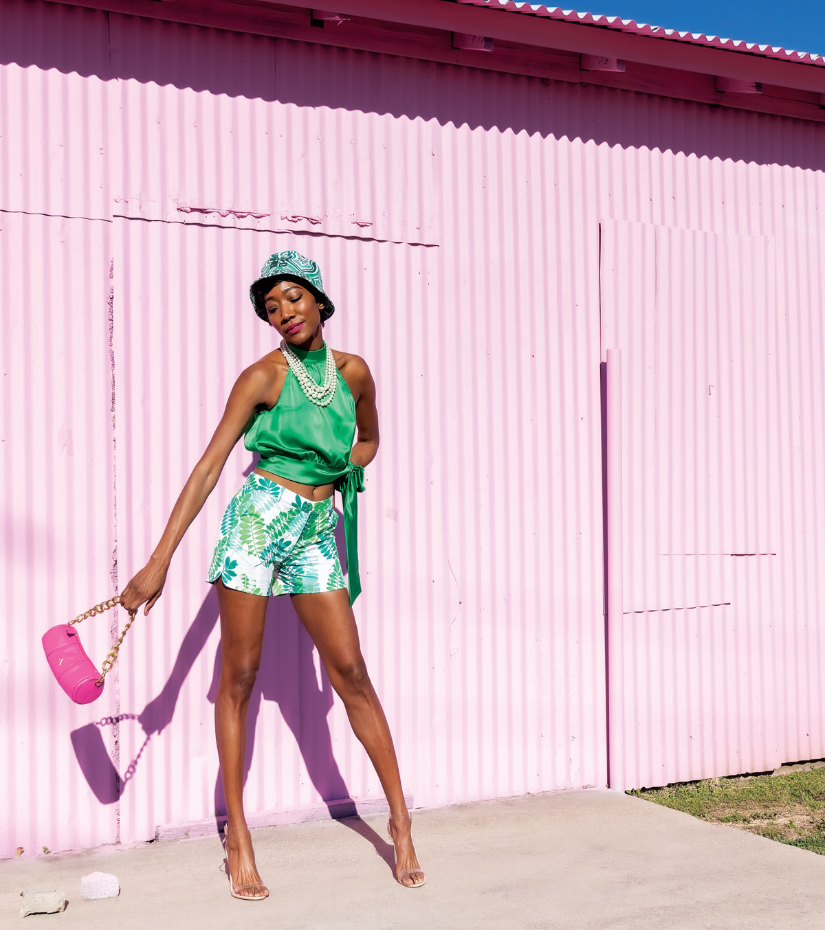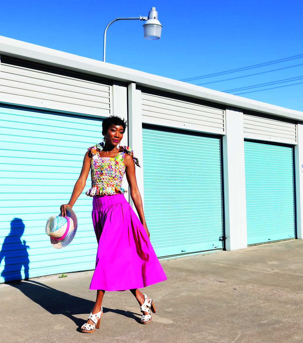 We love a monochromatic look, especially in a dazzling green. Posh Couture high-neck silk top ties dramatically at the waist, $225. Pair the blouse with these Jade cotton stretch shorts in a fresh print, $105, both pieces from XAR Clothier. Mix up patterns with Etro’s paisley-print bucket hat, $345, Neiman Marcus. Manu Atelier mini cylinder handbag, $415, Neiman Marcus. (Shoes courtesy of the model; pearl necklace courtesy of the stylist.)