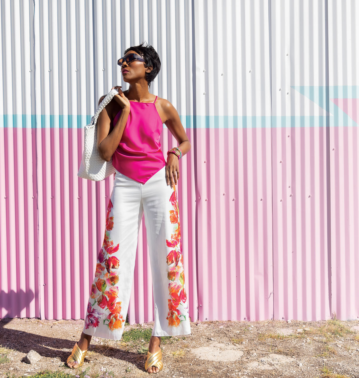 Slip into this silky ensemble and gold sandals, and you’re summer-ready. Posh Couture top, $265; Marc Cain wide-legged trousers in a tulip print, $525, both from XAR Clothier. Ilse Jacobsen woven vegan leather reversible tote (white to silver), $90, Monkee’s. Tory Burch sunglasses, $166, Neiman Marcus. Holst + Lee bracelets, $105 each, Monkee’s. (Shoes courtesy of the model.)