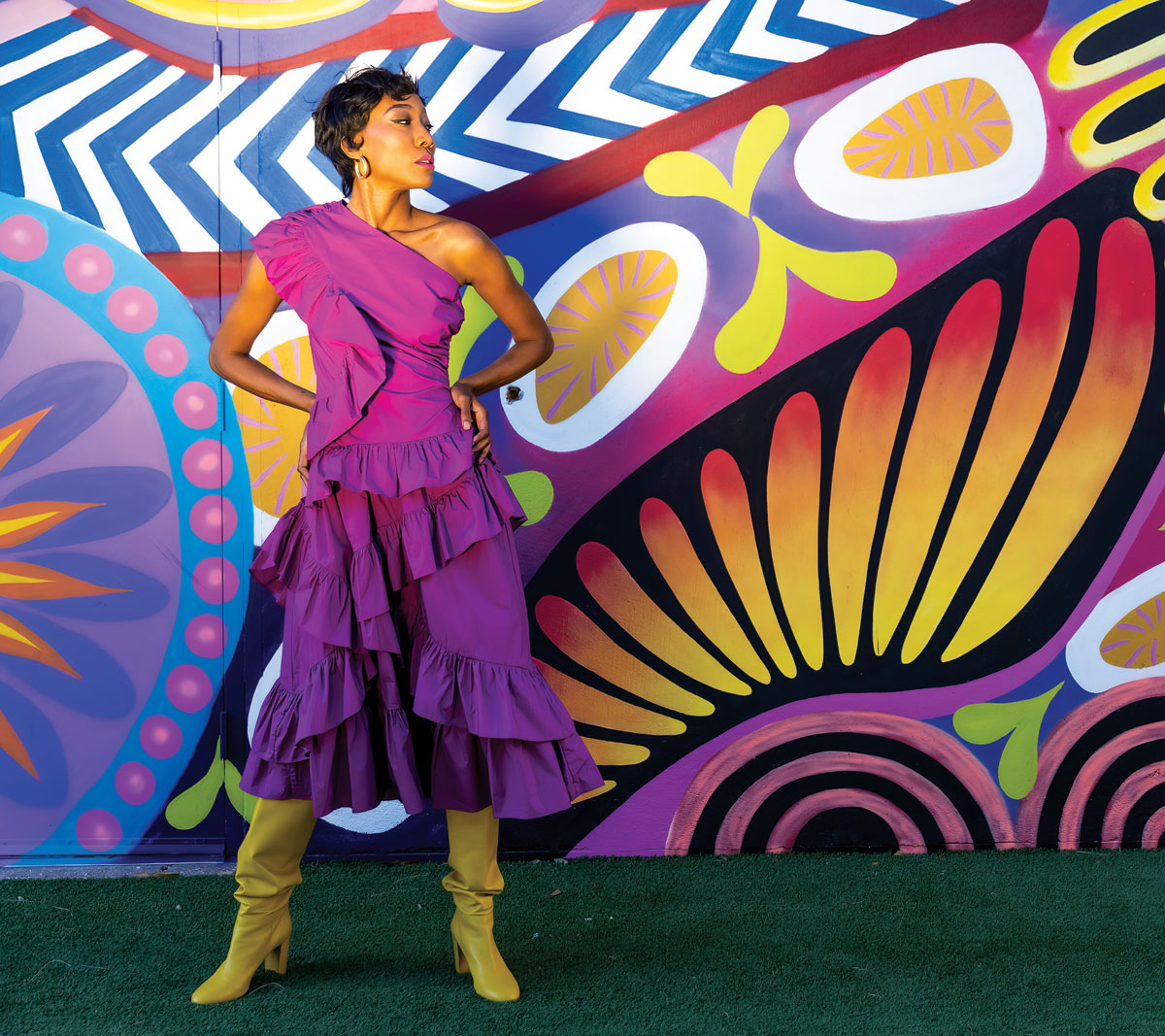 Step lively in the Ondine, designer Ulla Johnson’s ruffled one-shoulder dress in crisp cotton poplin. The draped bodice features a ruffle that cascades down one side and onto the layered tiers of the skirt, $675, You Are Here. Hoop earrings, $39.50, J. Crew. (Boots courtesy of the model.)