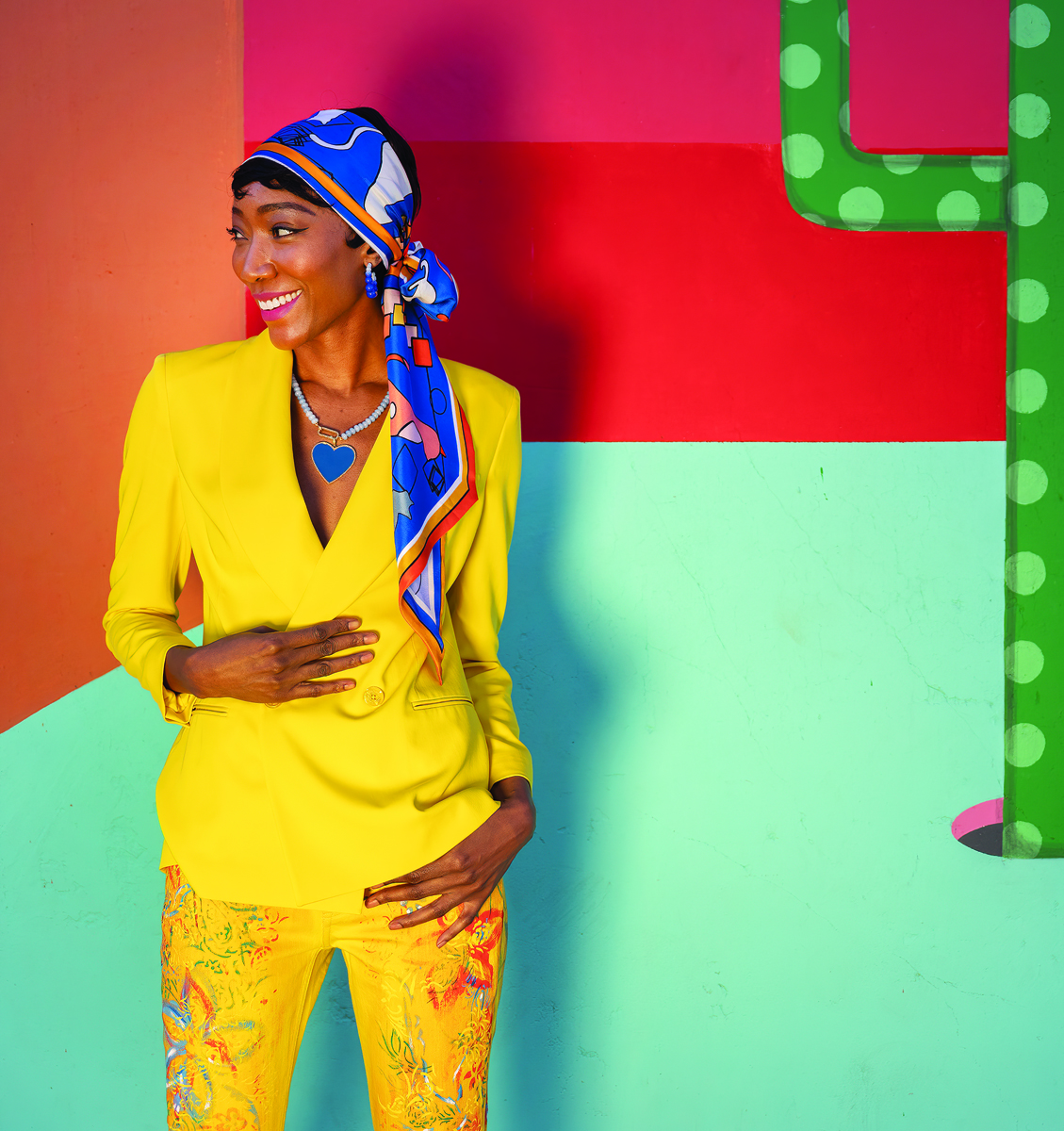 This ray of sunshine is brought to you courtesy of a Ralph Lauren Collection double-breasted blazer and painted jeans, $1,990 each, Neiman Marcus. Ruggiero Bignardi silk scarf, $125, Monkee’s. The Woods Fine Jewelry enamel heart and pavé diamond pendant, $660, and blue jade bead necklace with pavé diamond clasp, $715. Gas Bijoux beaded hoop earrings, $73, all from You Are Here.