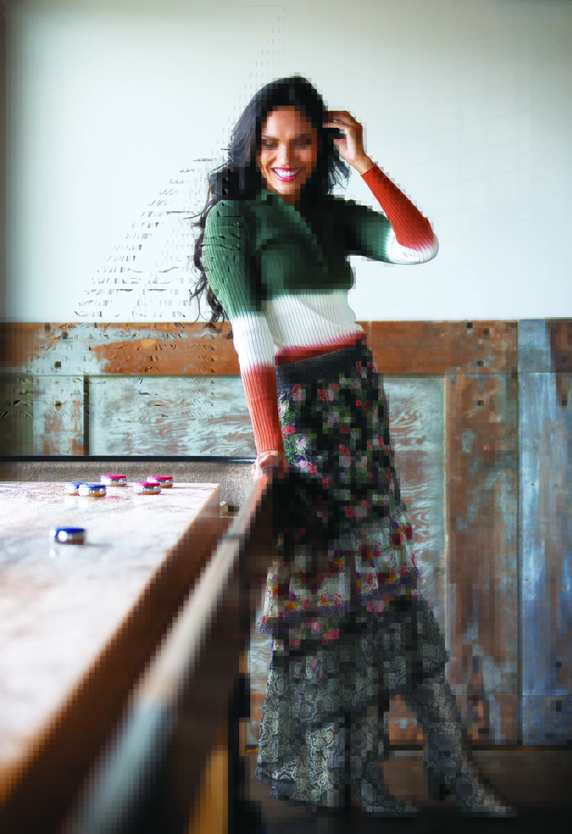 Derek Lam 10 Crosby’s Lisel rib-knit polo shirt ($395, Neiman Marcus Fort Worth) would look great with a pencil skirt or twill trousers, but we think it adds a modern touch to Alice + Olivia’s Caralie tiered-print maxi skirt ($395, Neiman Marcus Fort Worth). The reptile-print boots belong to the model.